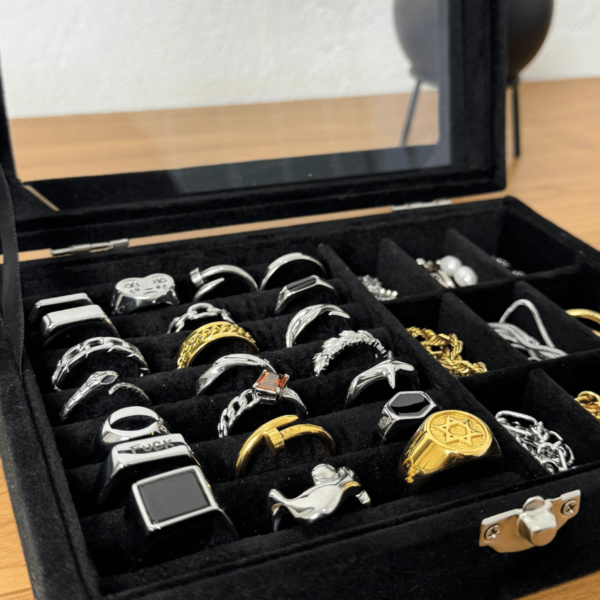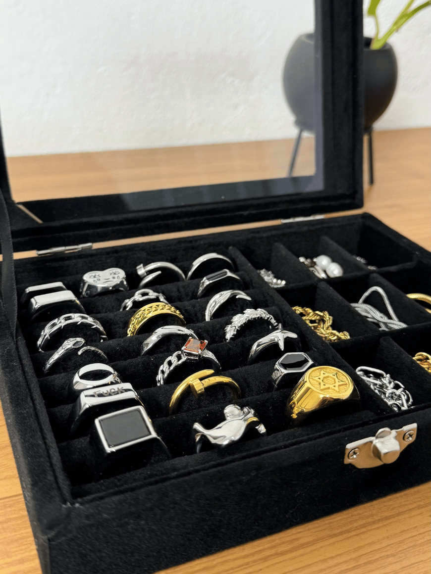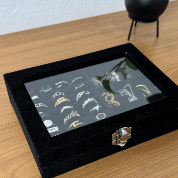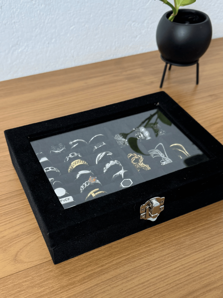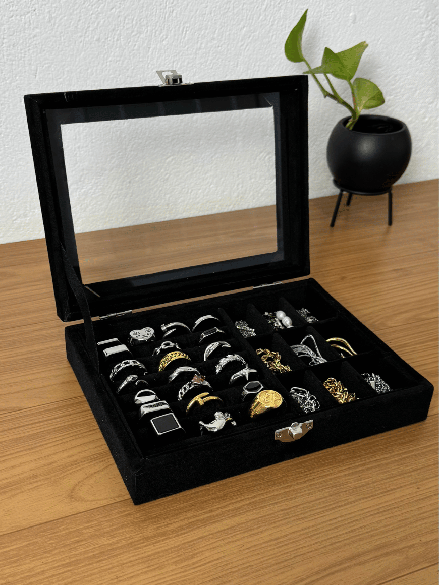 O Porta-Joias II foi pensado pra quem necessita manter os acessórios organizados com praticidade e um toque de sofisticação. Com tampa de vidro transparente, ele deixa seus anéis e peças favoritas sempre à mostra, sem abrir mão da proteção. O interior tem espaço amplo com divisórias, com destaque pra encaixes específicos de anéis, mas também conta com compartimentos versáteis pra guardar colares, pulseiras e brincos com facilidade. Ideal pra uso em casa, na penteadeira, estante ou até como peça decorativa.